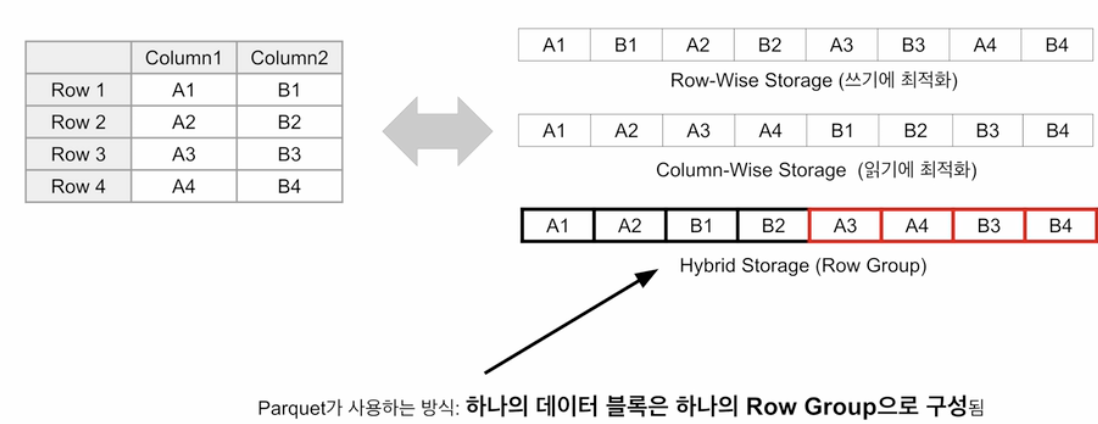 - 컬럼 스토리지: parquet을 제외하고 나머지 파일 포맷은 행별(column 기준)로 저장