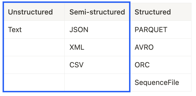 - Structured: PARQUET, AVRO, ORC, SequenceFile