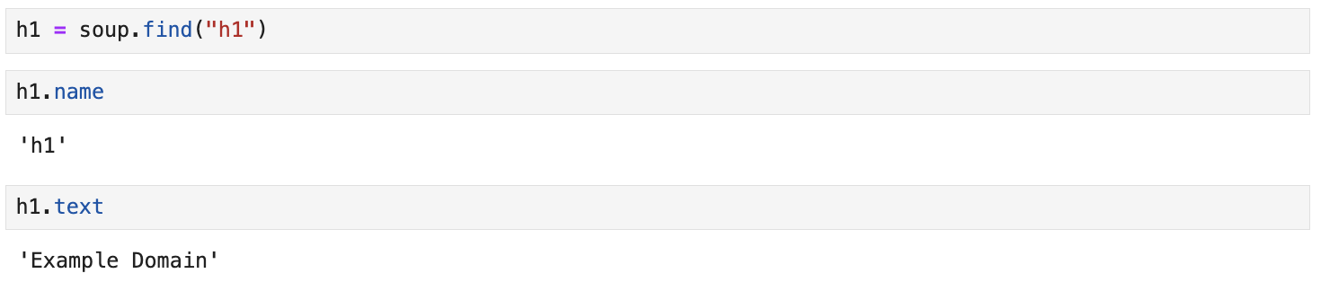 만약 <h1> 태그로 감싸진 요소를 찾고 싶다면, soup.find("h1") 과 같이 find 메소드로 찾을 수 있습니다.