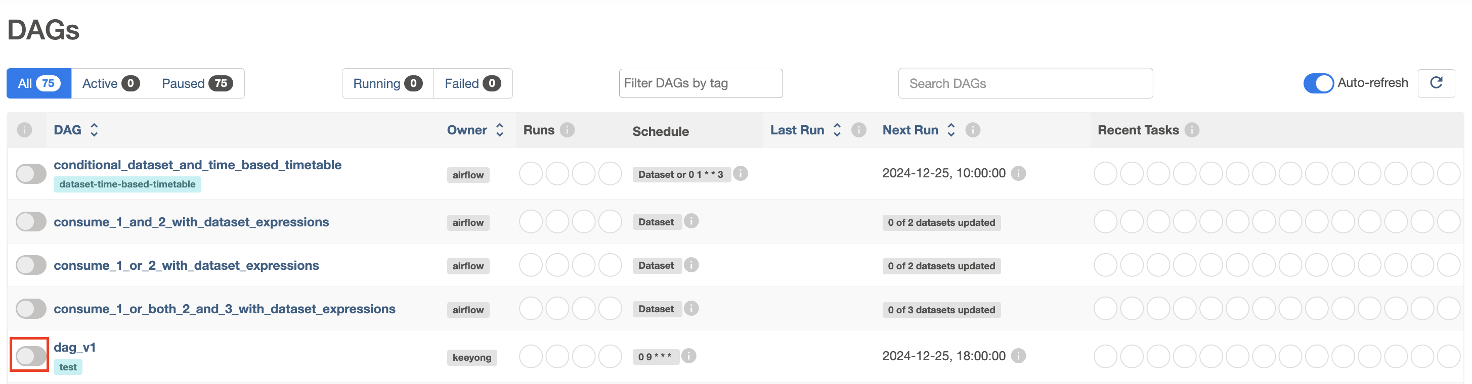 저장한 DAG ID가 확인되고 토글을 활성화하면 파란색으로 변경되고 오른쪽에 trigger start를 누르면